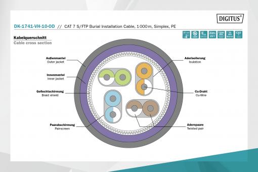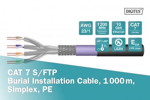 DIGITUS CAT 7 S-FTP PiMF installation cable, raw length 1000 m, drum, AWG 23/1, 1200 MHz, outdoor, PE, simplex, color black Future-oriented standards and high-end quality for your network.