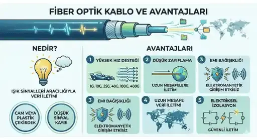 Fiber optik kablo, veriyi ışık sinyalleri aracılığıyla ileten cam veya plastik fiber çekirdeklerden oluşan bir iletim ortamıdır. Elektrik yerine ışık kullanıldığı için sinyal kaybı düşüktür ve uzun mesafelerde yüksek hızlarda veri iletimi sağlar.